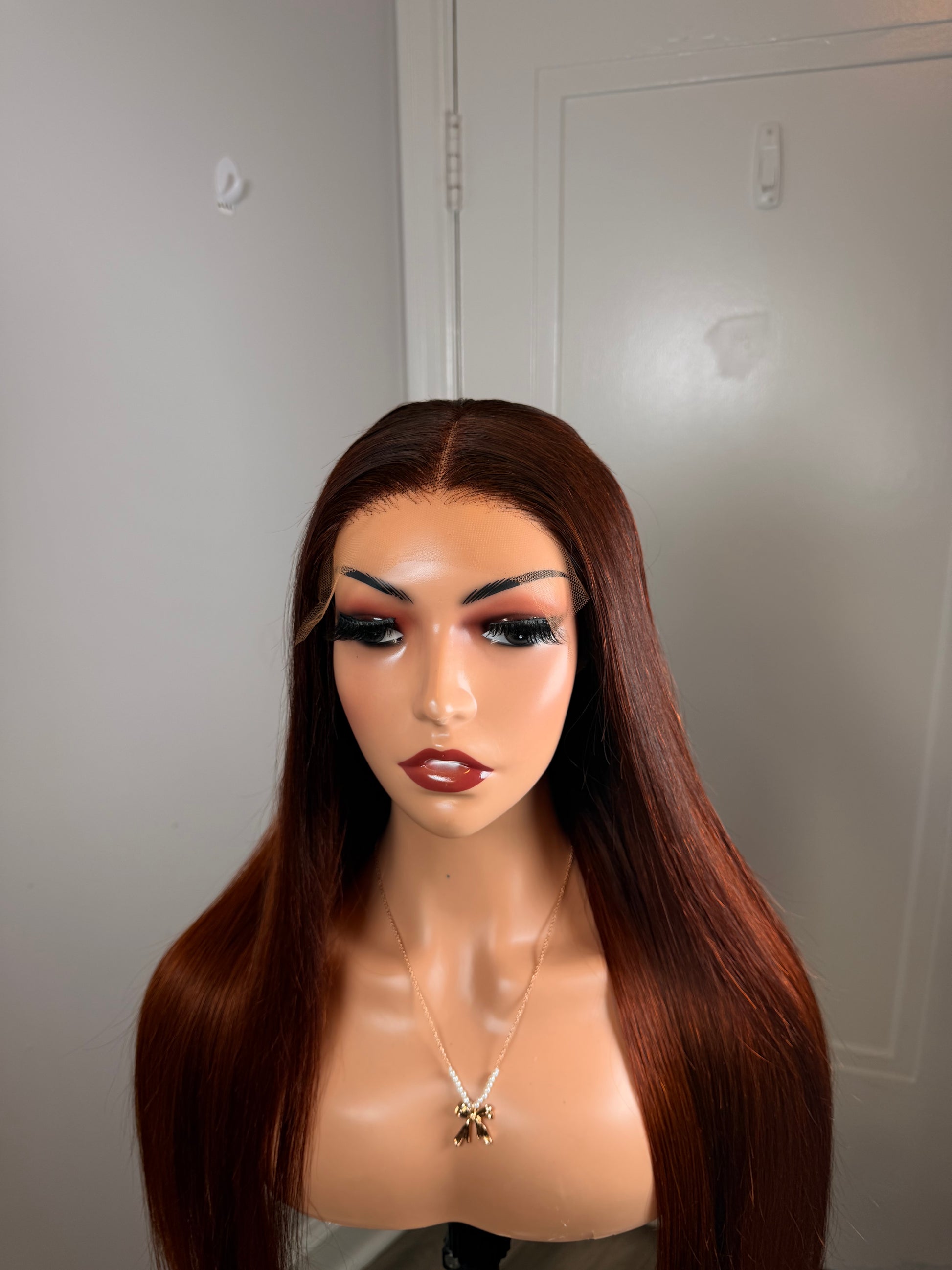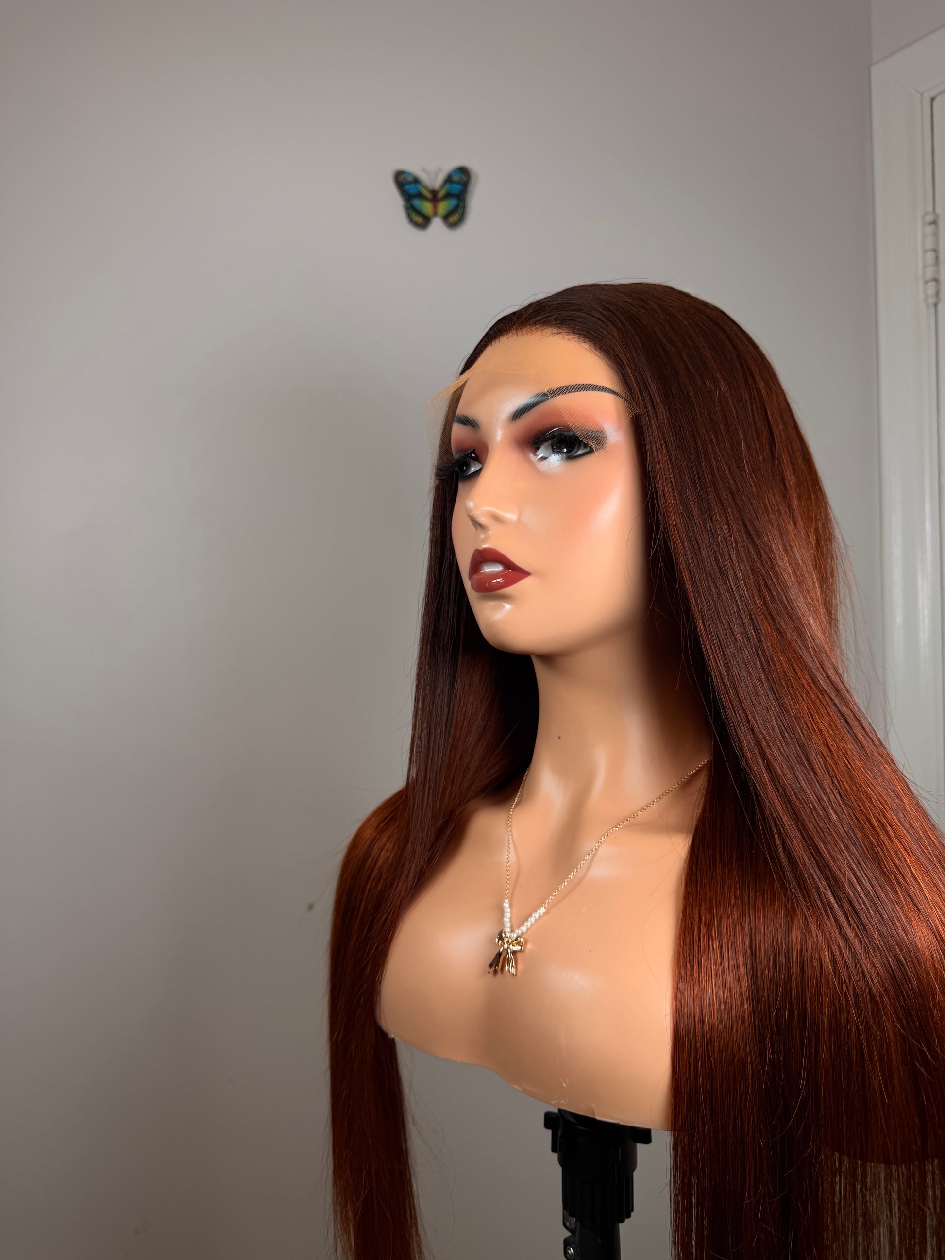 Warm auburn with soft copper undertones, finished with a natural brown root for depth and dimension.